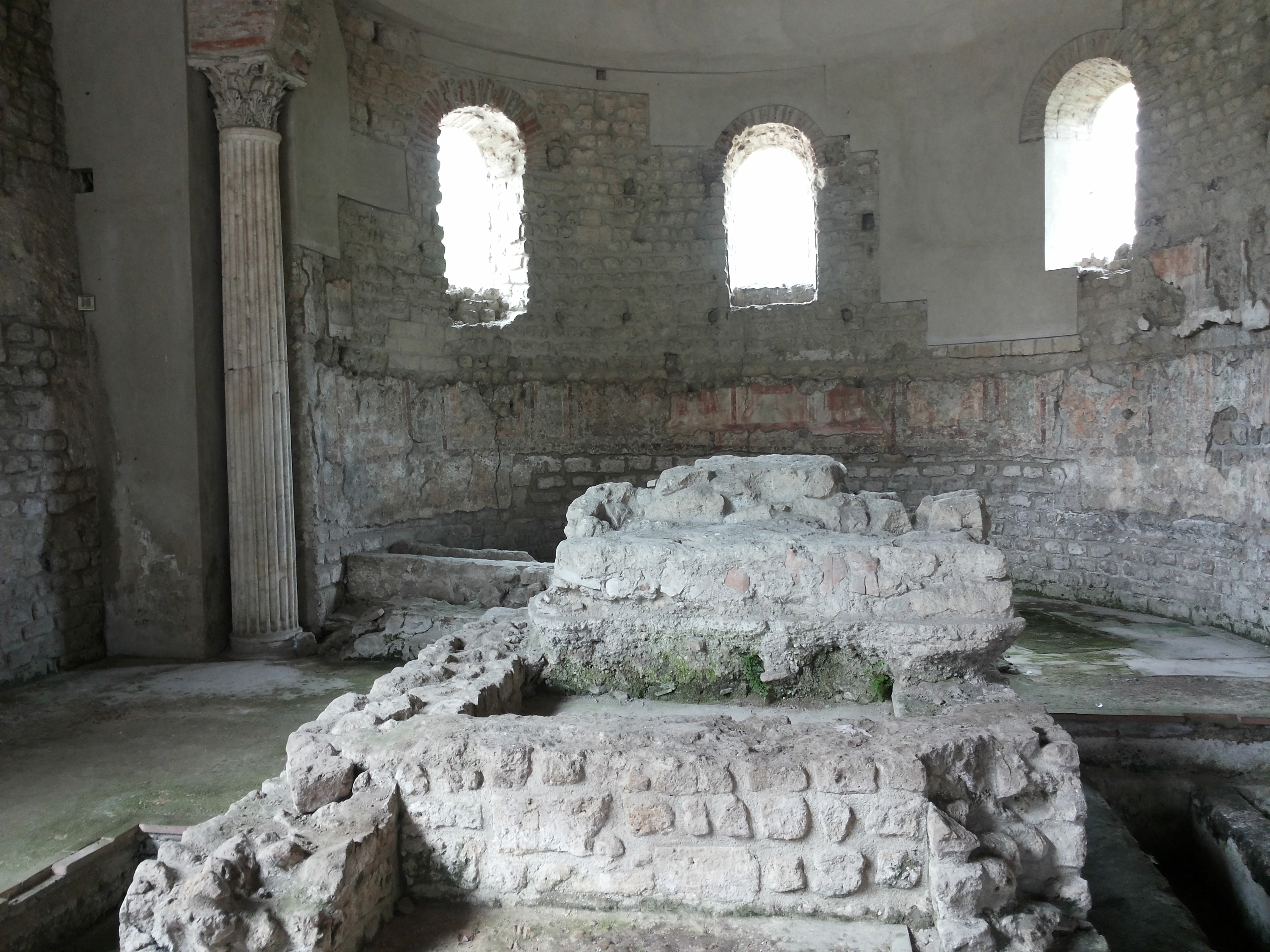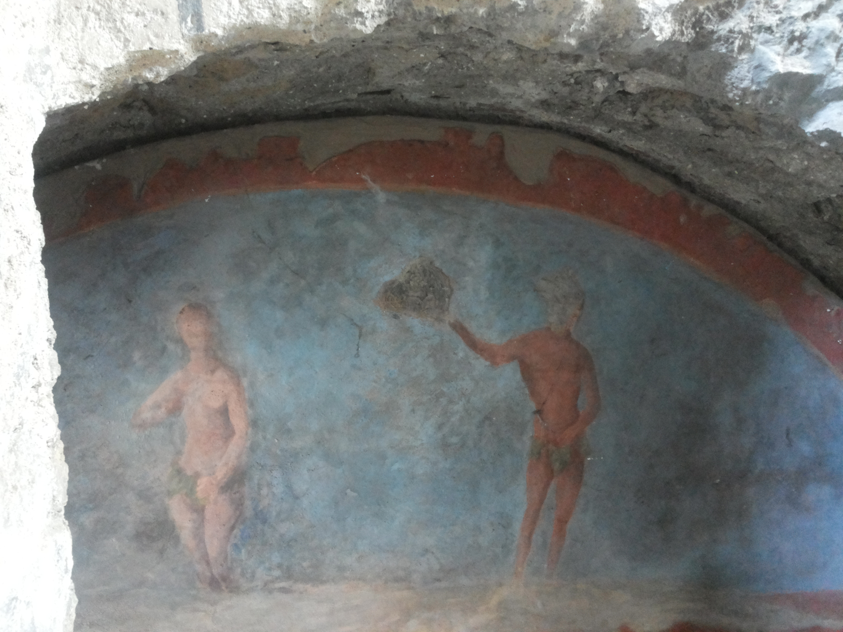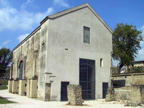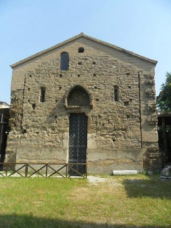 Aropp’ ‘o maciell’ ca facett’ l’alluvione infatti pigliajen’ ‘a part’ dell’abside trichora râ basilica addò stev’ pur’ nu bellu mosaico che però s’è perdut’ (ma ‘o sapimm’ pecché ne parla Paolino dint’ a ‘na lettera) e ce facetten’ ‘na chiesetta addò pittajen’ pur’ e mur’.