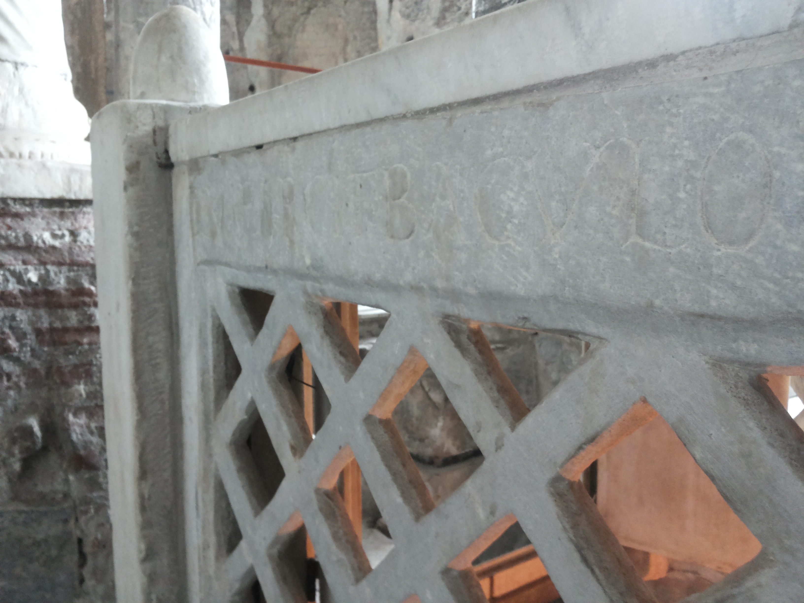 Della Basilica Nova che facett’ fraveca’ S.Paolino so’ rummas’ sul’ alcuni piezzicciull’ ca mò stann’ ‘nzippat’ dint’ â chiesa ‘e S.Giovanni che facetten’ praticament’ acopp’ a chell’ ca rummanev’ râ basilica che se sgarrupaje pe’ nu terremot’ che facett’ allaga’ tutt’ cos’; ‘e chest’ se ver’ ancor’ cocc’ culonn’, una sta dint’ a nu mur’, nu poc’ ‘e decorazion’ ‘e marmi tutt’ colorat’.