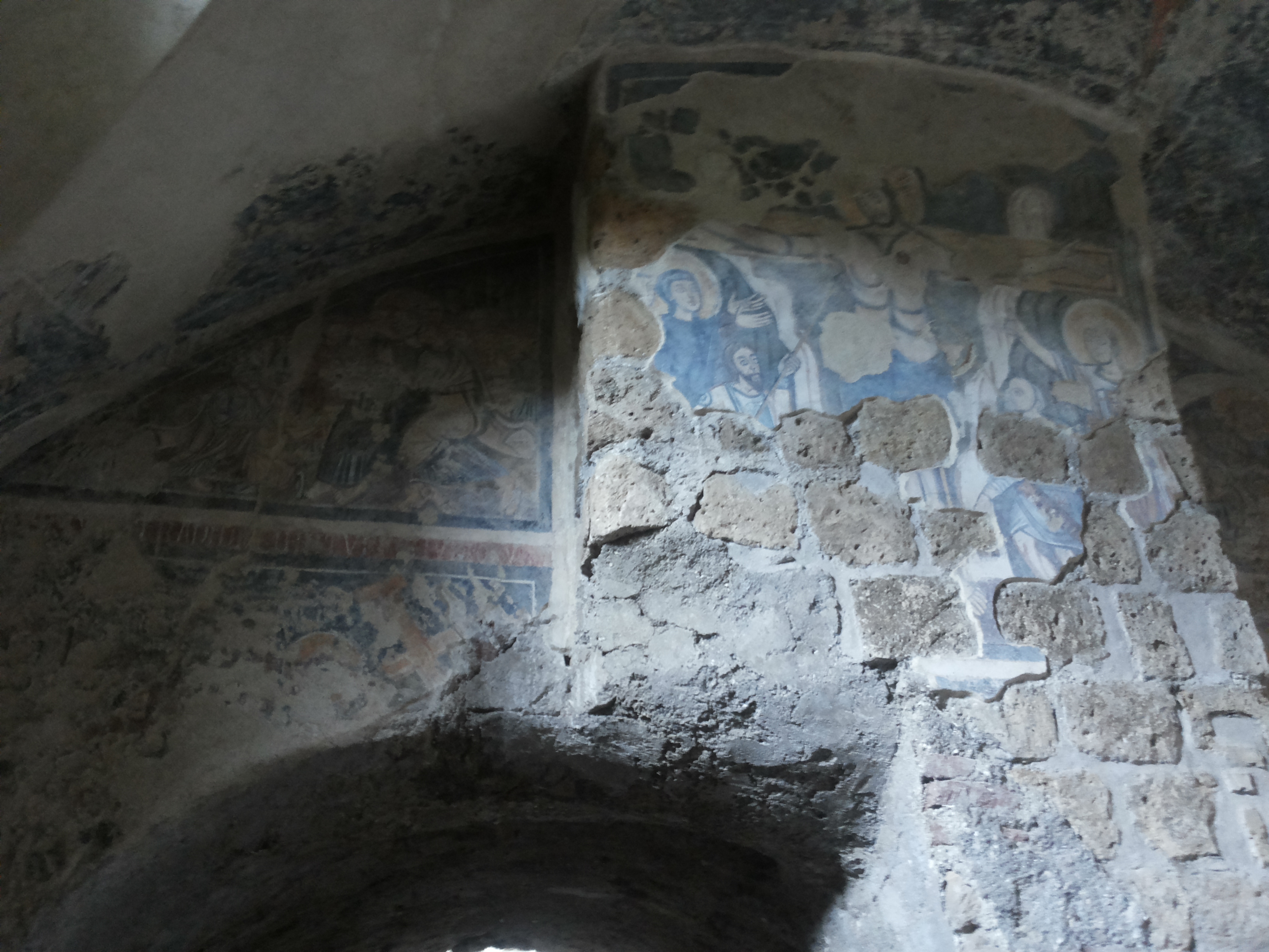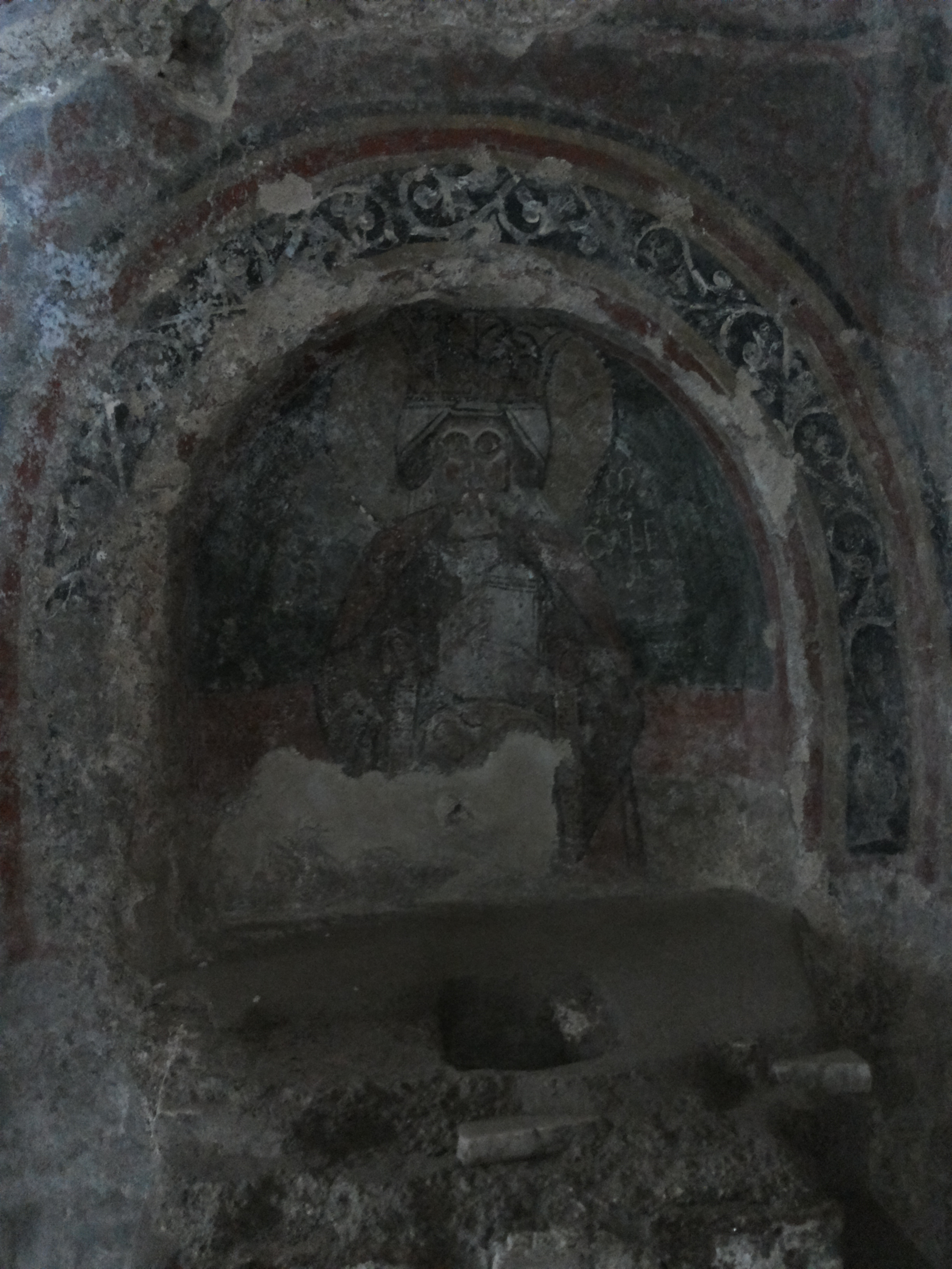 Trasenn’, ‘n copp’ â sinistra, stann’ dduje strat’ ‘e affreschi: ‘o cchiù antic’ cu l’albero di Jesse e ‘o cchiù recent’ invece, cchiù abbasc’, cu s.Giorgio, S. Giuann’ Battista e S.Nicola che piglia pê capill’ nu criatur’ cu nu boccal’ e ‘na coppa mman’.