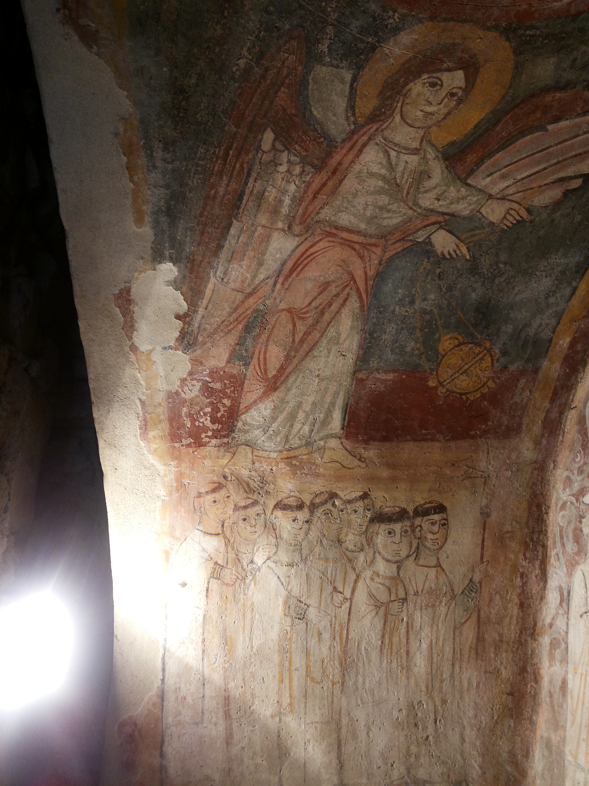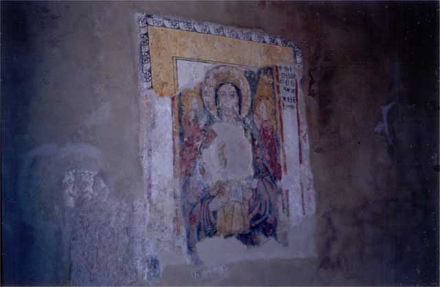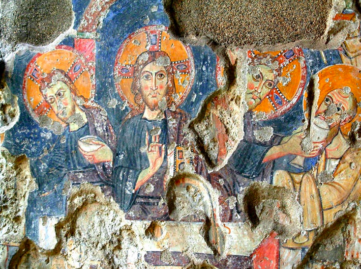 Comm’ ricev’ primm’, nu poc’ comm’ tutt’ ‘o complesso, pure dint’ a ‘stu spazio ce metteten’ man’ nu sacc’ ‘e vot’ e pe’ sparagna’ pigliavan’ e piezz’ ‘e chell’ch’evan’ vuttat’ ‘n terr’ e l’usavan’ ‘n’ata vot’; e pittavan’ pur’ ‘a copp’ accussì capita ‘e vere’, vicino a cierti pittur’ medieval’ addò e cristian’ tenen’ l’uocchie ruoss’ ruoss’, cristian’ nu poc’ cchiù accunciatiell’ comm’ ‘stu Cristo, rô quattucient’, che quann’ l’agg’ vist’ m’ha colpito assaje. A proposito ‘e Cristo, assaje particolar’ è ‘na raffigurazion’ râ fin’ rô X secolo addò ‘o tema ‘e l’eucarestia è rappresentato câ figur’ ‘e Nostro Signore pe’ tre vvot’, comm’ si foss’ nu fotogramma; putimm’ dicer’ che è ‘n affresco futurista ante-litteram (po’ vô spiego chi so’ e futuristi…).