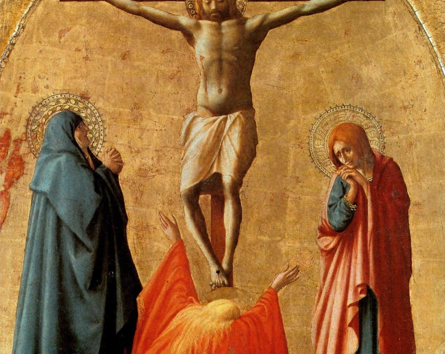 Allora, innanzitutto era nu piezz’ che stev’ â part’ ‘e copp’ ‘e nu polittico che ‘o vulev’ nu tip’ ca se chiammav’ Ser Giuliano di Colino ca poiché era nu notaio tenev’ nu sacc’ e sord’ e se putev’ permetter’ ‘e chiamma’ a fatica’ a Masaccio che a chilli tiemp’ – ô 1426 – era nu giuvinott’ ‘e belle prospettive. Praticamente Masaccio eva pitta’ ‘na pala d’altare ca s’eva metter’ dint’ â cchies’ rô Carmine a Pisa addò stev’ ‘o taut’ ‘e tutta ‘a famiglia son e ‘sta pala era fatt’ ‘e piezz’. Nuje a Napul’ tenimm’ ‘o piezz’ ‘e copp’, comm’ ricev’ primm’ appunto, e chist’ è ‘o mutiv’ râ cap’ dint’ ‘e scell’; nun è che Masaccio nun sapev’ pitta’, anzi! Chill’ se facett’ bbuon’ e cunt’ câ prospettiv’ pensann’ ca chi stev’ annanz’ all’opera eva aizza’ ‘a cap’ pe’ vere’, da bbasc’ â copp’, a Gesù Crist’.