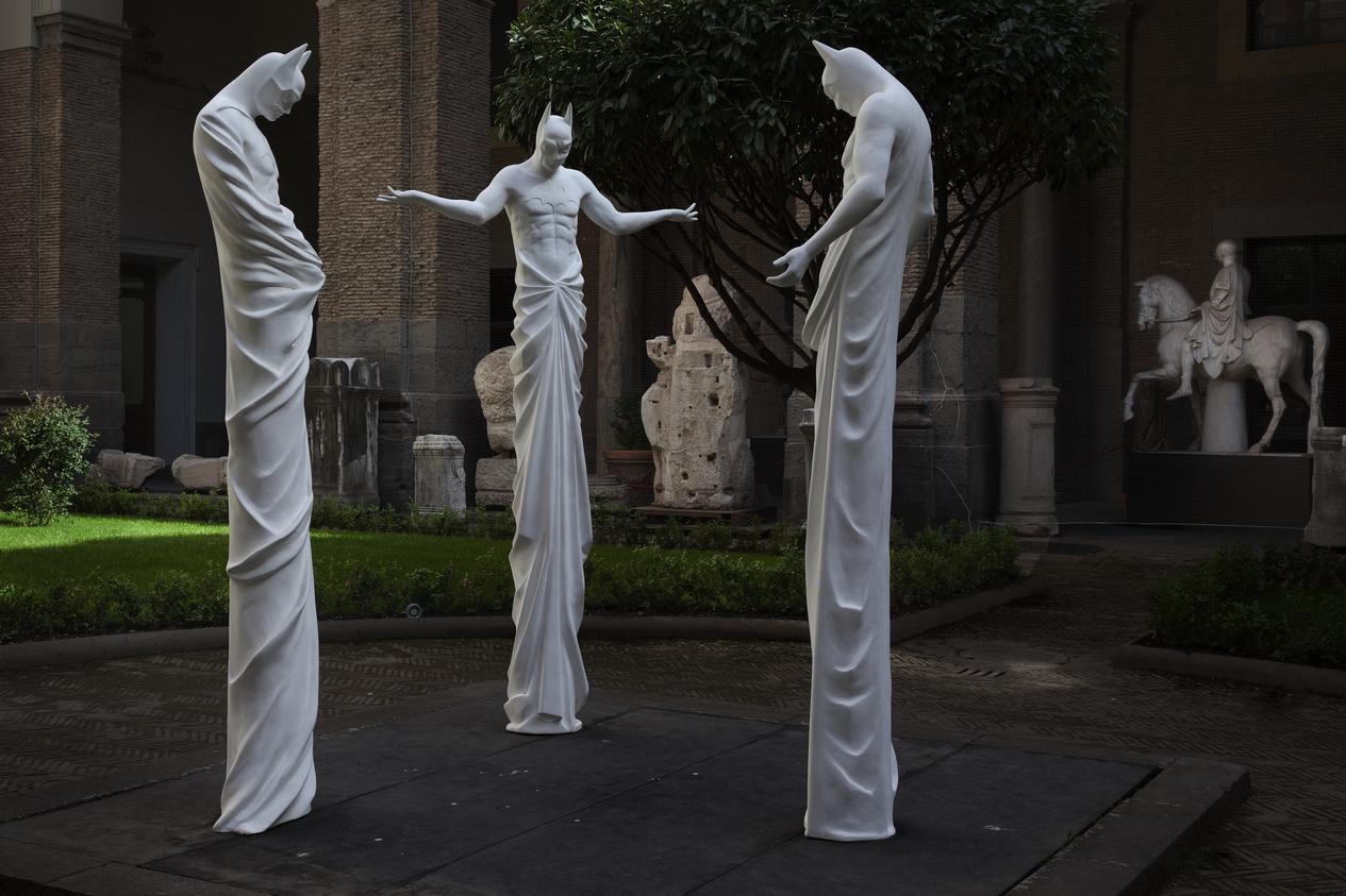 Primm’ e jì annanz’, dint’ ȃ Galleria Farnese addò stann’ ati fatt’, for’ ȏ ciardin’ cestann’ tre statue gigantesche ‘e Batman ca par’ che stann’ attuorn’ a nu fucular’.